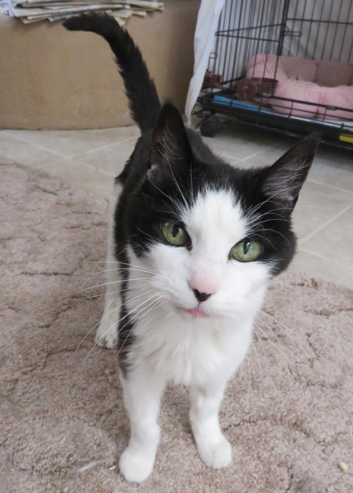 Today, we celebrate our oldest cat, Jingles. This charming black-and-white girl with a black spot on her nose came to us in September 2015 from the Albuquerque Animal Welfare Department when she was about 18 years old. As she settled in at Hannah’s House, our main rescue home, her sweet personality worked its way into our hearts in no time. She was happy to have a warm bed, a spot in a sunbeam, gentle pets, and the love of her foster.